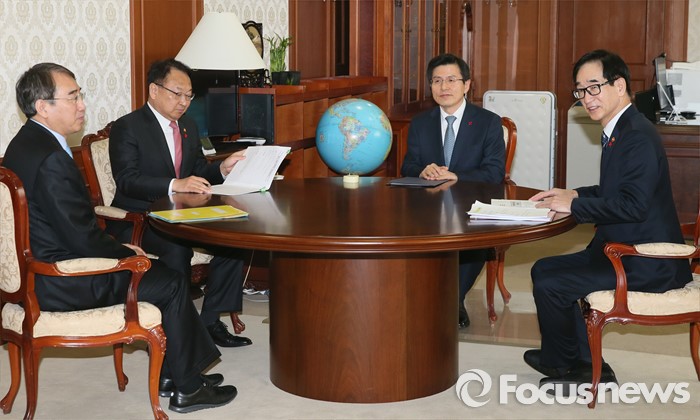 (서울=포커스뉴스) 28일 오전 서울 종로구 정부서울청사에서 이석준(왼쪽부터) 국무조정실장, 유일호 경제부총리 겸 기획재정부 장관, 황교안 총리, 이준식 사회부총리 겸 교육부장관이 총리-부총리 협의회에 앞서 이야기를 나누고 있다.
