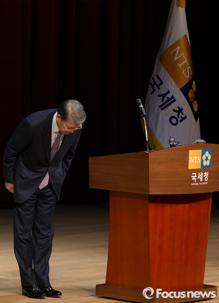 (세종=포커스뉴스) 임환수 국세청장이 28일 오전 세종시 정부세종2청사 국세청에서 열린 전국세무관서장회의에 참석해 당부말을 마치고 인사하고 있다.