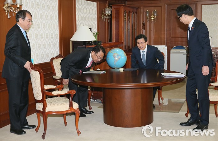 (서울=포커스뉴스) 28일 오전 서울 종로구 정부서울청사에서 이석준(왼쪽부터) 국무조정실장, 유일호 경제부총리 겸 기획재정부 장관, 황교안 총리, 이준식 사회부총리 겸 교육부장관이 총리-부총리 협의회에 앞서 자리에 앉고 있다.