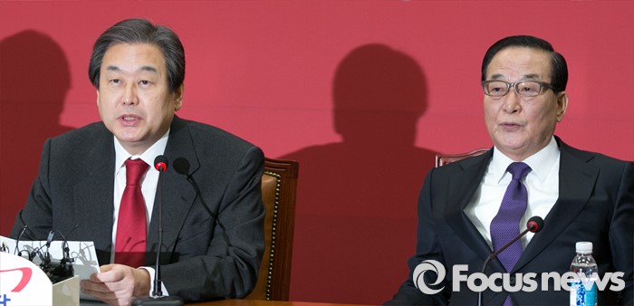 (서울=포커스뉴스) 김무성(왼쪽) 새누리당 대표가 28일 오전 서울 여의도 국회에서 열린 최고위원회의에 참석해 모두발언하는 동안, 서청원 최고위원이 경청하고 있다.