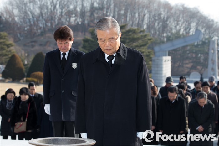 (서울=포커스뉴스) 28일 오전 서울 강북구 국립 4.19 묘지에서 김종인 선거대책위원장 겸 비대위원장이 사월 학생 혁명 기념탑 참배 후 묵념을 하고 있다.