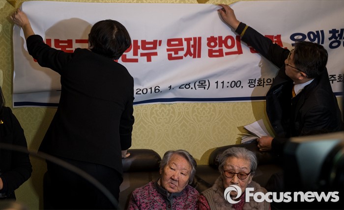(서울=포커스뉴스) 28일 오전 서울 마포구 평화의 우리집에서 열린 일본군'위안부' 문제합의 관련, 유엔 청원서 제출 기자회견에서 참석자들이 현수막을 고정하고 있다.