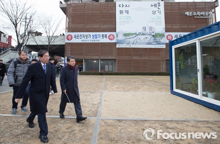 (서울=포커스뉴스) 박원순 서울시장이 28일 오전 서울 종로구 세운상가에서 세운상가 재생사업 현장 설명회를 마친 후 세운상가 주변 경관을 둘러보고 있다.