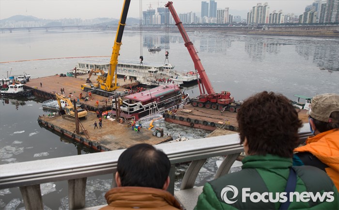 (서울=포커스뉴스) 28일 오후 서울 한강 영동대교 인근에서 시민들이 침수된 이랜드 크루즈 유람선 인양 작업을 바라보고 있다.