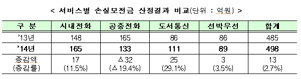 서비스별 손실보전금은 시내전화 165억원, 공중전화 133억원, 도서통신 111억원, 선박무선 89억원 등 총 498억원으로 전년도 485억원에 비해 13억원이 증가했다.