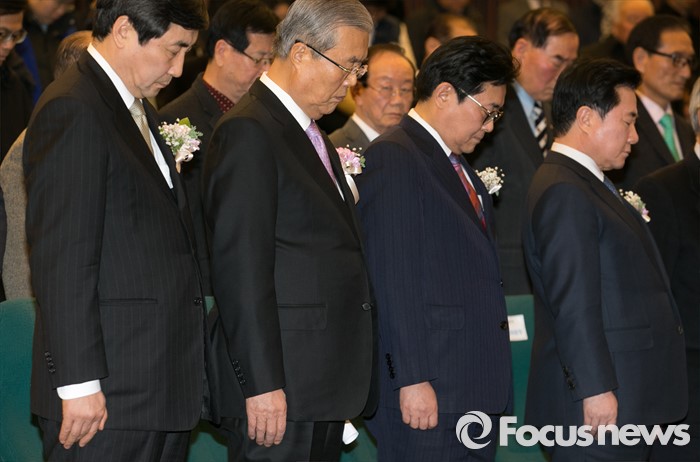 (서울=포커스뉴스) 28일 오후 서울 여의도 국회도서관에서 열린 더불어민주당 60년사 출판기념회에 참석한 이석현(앞줄 오른쪽부터) 국회 부의장, 전병헌 창당60주년 기념사업추진위원장, 김종인 비대위원장, 이종걸 원내대표 등 참석자들이 묵념을 하고 있다.