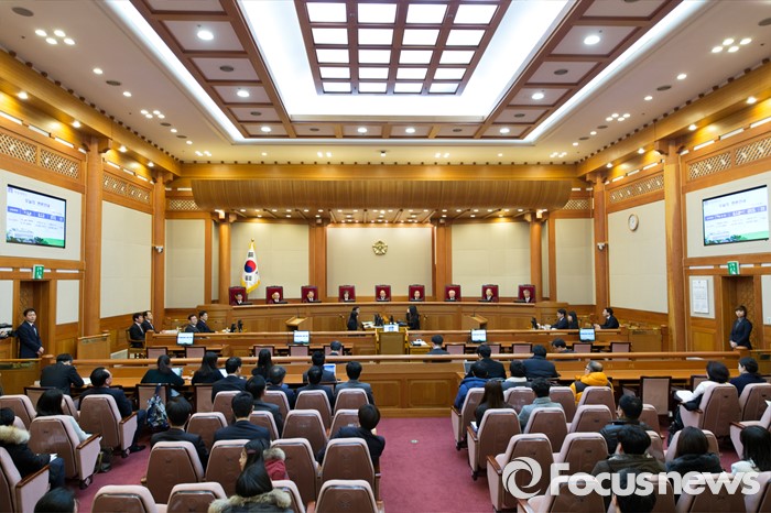 (서울=포커스뉴스) 28일 오후 서울 종로구 헌법재판소 대심판정에서 박한철 헌법재판소장이 국회 선진화법 권한쟁의 공개변론 시작을 기다리고 있다. 이날 새누리당 주호영, 권성동 의원이 청구인 자격으로 출석했다.