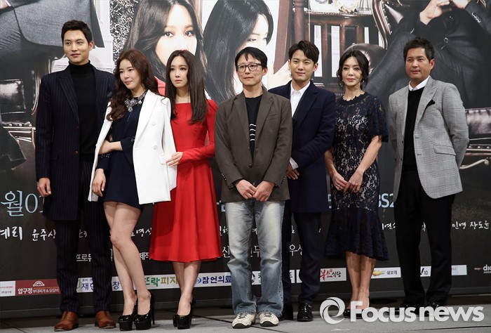 (서울=포커스뉴스) 28일 오후 서울 강남구 임피리얼 팰리스 호텔에서 열린 KBS 2TV 저녁 일일드라마 ' 천상의 약속' 제작발표회에 참석한 배우 송종호(왼쪽부터), 박하나, 이유리, 전우성(감독), 서준영, 김혜리, 이종원이 포토타임을 갖고 있다.