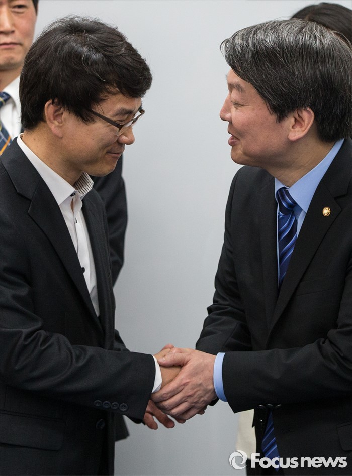 (서울=포커스뉴스) 28일 오후 서울 강남구 창업지원센터에서 열린 '국민의당-핀테크 기업인 간담회'에 참석한 안철수(오른쪽) 인재영입위원장이 국민의당 정책자문으로 영입된 유철종 크라우드연구소 대표와 악수하고 있다.