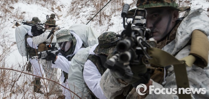 (평창=포커스뉴스) 28일 강원도 평창군 황병산 해병대 산악 종합훈련장에서 열린 '한·미 해병대 연합 동계 설한지 훈련'에 해병대 수색대대와 미 해병대 3사단 수색중대 장병들이 참가하고 있다.