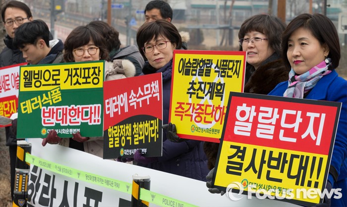 (세종=포커스뉴스) 28일 오후 세종시 정부세종청사 1동 앞에서 한국기독교총연합회, 한국교회연합회, 한국장로교총연합회, 한국교회언론회 등 종교인들이 집회를 갖고 할랄식품 테마단지 추진을 중단할 것을 촉구하고 있다.