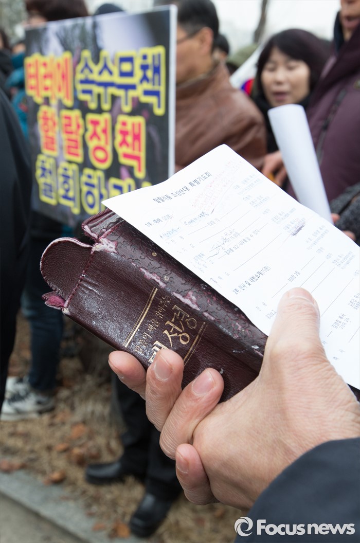 (세종=포커스뉴스) 28일 오후 세종시 정부세종청사 1동 앞에서 한국기독교총연합회, 한국교회연합회, 한국장로교총연합회, 한국교회언론회 등 종교인들이 집회를 갖고 할랄식품 테마단지 추진을 중단할 것을 촉구하고 있다.