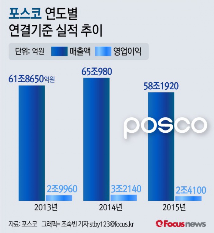 (서울=포커스뉴스) 포스코는 28일 서울 여의도 한국거래소에서 2015년 연간 실적발표회를 열고 연결기준 매출액이 전년 대비 10.6% 감소한 58조1920억원, 영업이익이 같은 기간 25% 줄어든 2조41000억원을 기록했다고 밝혔다.