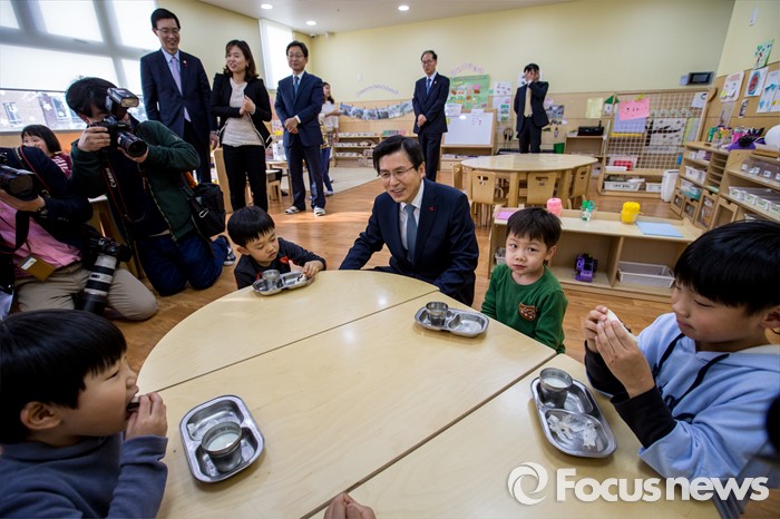 (서울=포커스뉴스) 만3-5세 유아에게 공통적으로 제공하는 교육, 보육 과정인 누리과정 예산 파행으로 보육대란이 이어지고 있는 28일 오후 서울 종로구 한 어린이집을 찾은 황교안 국무총리가 어린이들과 대화를 나누고 있다.