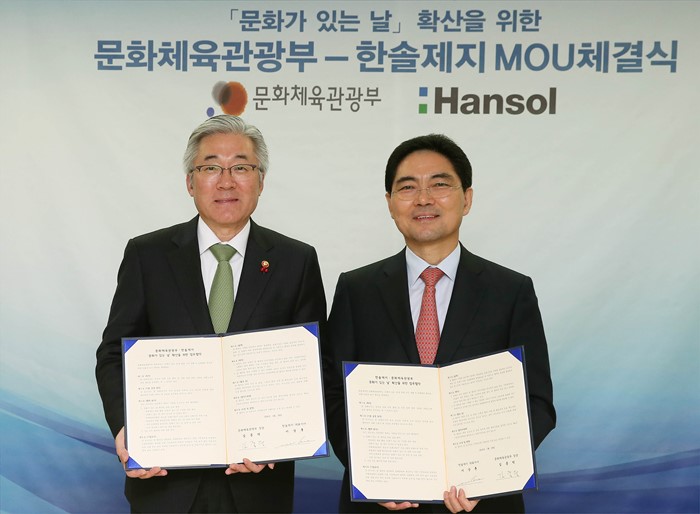 (서울=포커스뉴스) 28일 서울 용산구 국립극단 회의실에서 '문화가 있는 날' 확산을 위한 업무협약(MOU) 체결식에서 김종덕 문화체육관광부 장관과 이상훈 한솔제지 대표이사가 업무협약서에 서명을 마친 뒤 기념촬영을 하고 있다. <사진제공=문화체육관광부>