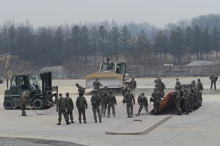 (청주=포커스뉴스) 28일 충북 청주 공군 제17전투비행단에서 시설대대 피해복구반 장병들이 활주로 피해복구훈련을 실시하고 있다. <사진제공=공군 제17전투비행단>