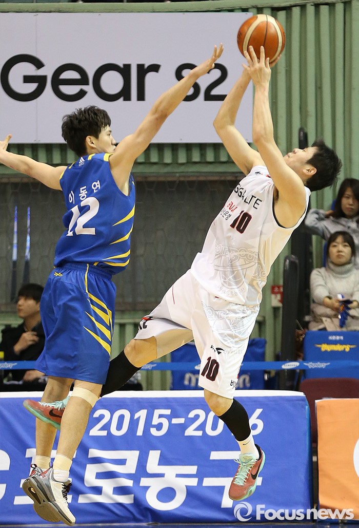 (서울=포커스뉴스) 28일 서울 잠실실내체육관에서 열린 2015-2016 프로농구 삼성-KT 경기에서 KT 조성민이 삼성 이동엽의 마크를 피하며 슈팅을 시도하고 있다.