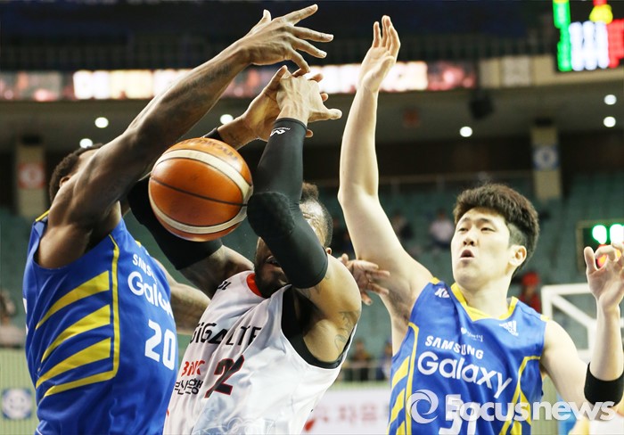 (서울=포커스뉴스) 28일 서울 잠실실내체육관에서 열린 2015-2016 프로농구 삼성-KT 경기에서 KT 블레이클리(가운데)와 삼성 라틀리프가 치열한 리바운드 다툼을 하고 있다.