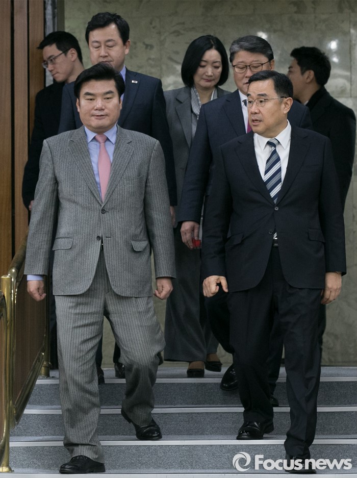 | △ 원내대책회의 입장하는 원유철·김정훈 |