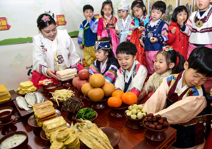 (서울=포커스뉴스) 설 명절을 열흘여 앞둔 28일 서울 서초구 하나로클럽 양재점에서 한복을 차려입은 어린이들이 설 차례상 차리는 법을 배우고 있다. <사진제공=농협유통>