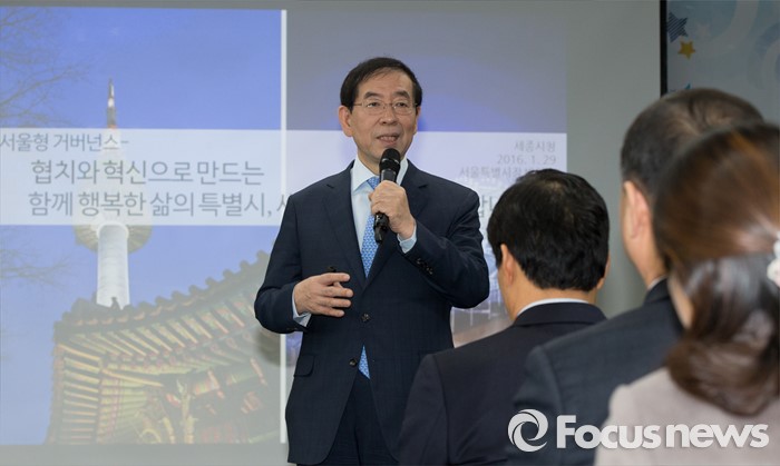 (세종=포커스뉴스) 박원순 서울시장이 29일 오전 세종시청 대강당에서 '협치와 혁신으로 만드는 함께 행복한 삶의 특별시, 세종시와 함께합니다'를 주재로 특강을 하고 있다.