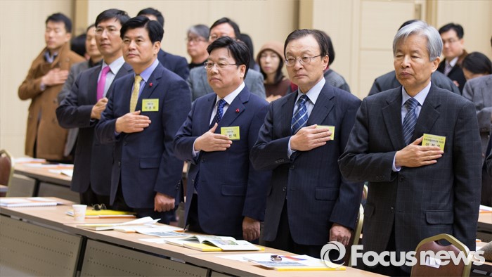 (세종=포커스뉴스) 29일 오전 세종시 정부세종컨벤션센터 국제회의장에서 열린 국가균형발전선언 12주년 기념행사에 참석한 내빈들이 국기에 대한 경례를 하고 있다. 오른쪽부터 이정우 한국미래발전연구원 이사장, 이해찬 노무현재단이사장, 권선택 대전시장, 이춘희 세종시장, 안희정 충남도지사.