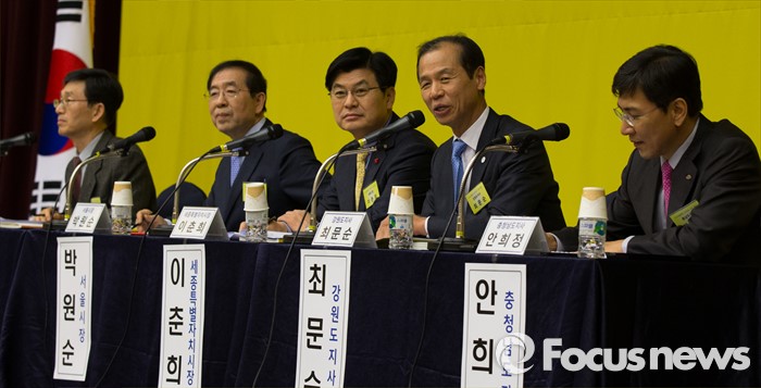 (세종=포커스뉴스) 29일 오후 세종시 정부세종컨벤션센터 국제회의장에서 열린 국가균형발전선언 12주년 기념행사 및 심포지움에 참석한 최문순 강원지사가 인사말을 하고 있다. 왼쪽부터 성경륭 한림대교수, 박원순 서울시장, 이춘희 세종시장, 최문순 강원지사, 안희정 충남지사.