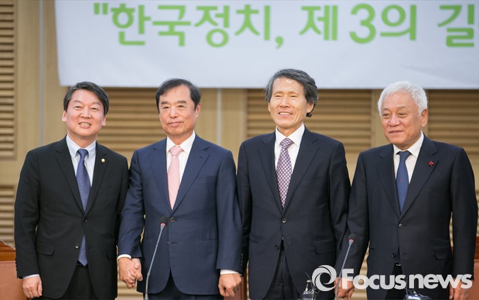 (서울=포커스뉴스) 29일 오후 서울 여의도 국회 의원회관에서 열린 '참여정부 시절 청와대 정책실장을 지낸 김병준 국민대 교수 초청 간담회, 한국정치 제3의 길을 말한다'에 참석한 안철수(오른쪽부터) 국민의당 인재영입위원장, 김 교수, 한상진 공동창당준비위원장, 김한길 상임부위원장이 취재진을 향해 포즈를 취하고 있다.
