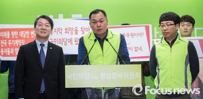 (서울=포커스뉴스) 환경미화원 임종성씨가 29일 오후 서울 마포구 국민의당 당사에서 입당 기자회견을 하고 있다. 왼쪽부터 안철수 의원, 임종성, 배성춘씨