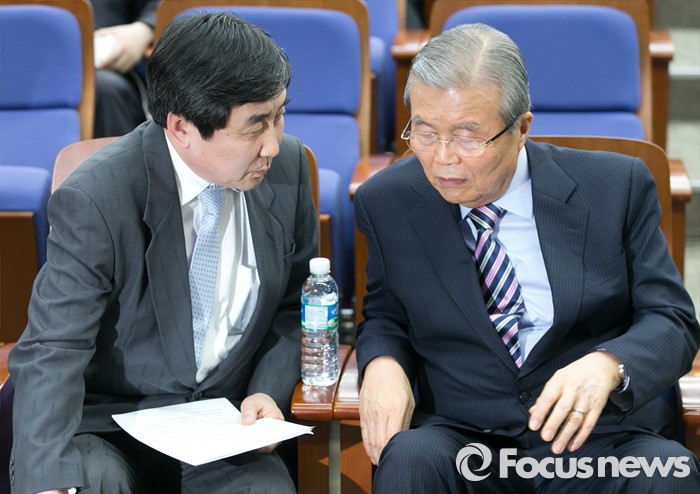 (서울=포커스뉴스) 김종인(오른쪽) 더불어민주당 비대위원장과 이종걸 원내대표가 29일 오후 서울 여의도 국회에서 열린 의원총회에 참석해 대화하고 있다.