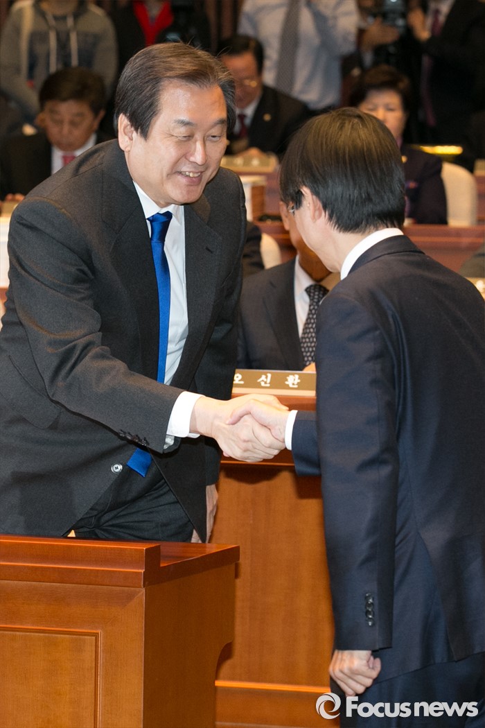 (서울=포커스뉴스) 새누리당에 입당한 조경태(오른쪽) 의원이 29일 오후 서울 여의도 국회에서 열린 새누리당 의원총회에 참석해, 김무성 대표와 악수하고 있다.