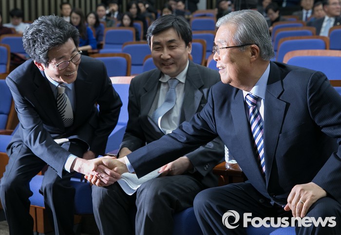 (서울=포커스뉴스) 김종인(오른쪽) 더불어민주당 비대위원장과 이목희(왼쪽) 정책위의장이 29일 오후 서울 여의도 국회에서 열린 의원총회에 참석해 인사하고 있다. 가운데는 이종걸 원내대표.