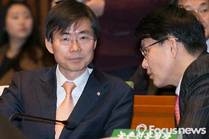 (서울=포커스뉴스) 새누리당에 입당한 조경태(왼쪽) 의원이 29일 오후 서울 여의도 국회에서 열린 새누리당 의원총회에 참석해 윤상현 의원과 대화하고 있다.