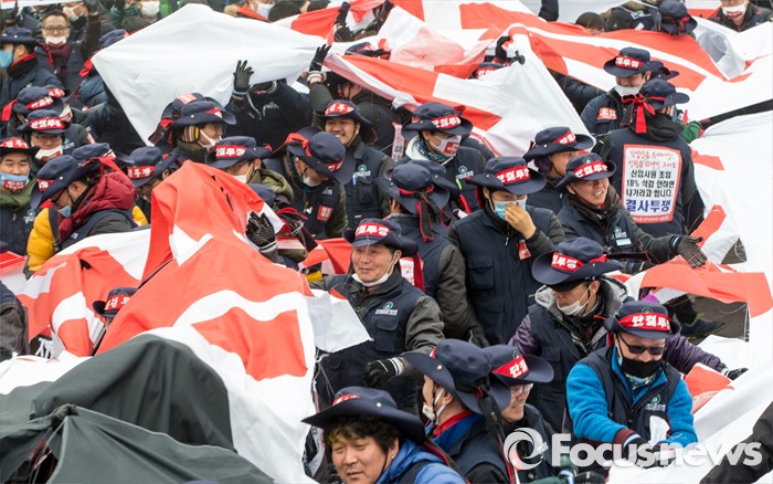 (서울=포커스뉴스) 29일 오후 서울역 광장에서 열린 '한국노총 전국 단위노조 대표자 총력투쟁 결의대회'에 참석한 조합원들이 정부가 발표한 양대 행정지침 폐기를 촉구하는 대형 현수막을 찢고 있다.