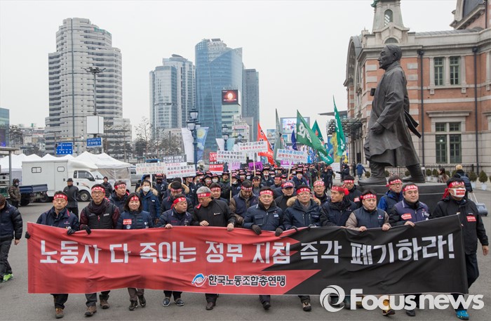 (서울=포커스뉴스) 29일 오후 서울역 광장에서 열린 '한국노총 전국 단위노조 대표자 총력투쟁 결의대회'에 참석한 조합원들이 서울광장을 향해 행진하고 있다.