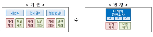 금융위는 “사후보고를 통해 최종투자자의 투자내역을 알 수 있다”며 “외국인 투자등록제도의 핵심기능인 외환·주식시장 모니터링이 가능하다”고 말했다.외국인통합계좌 변경 전후<사진제공=금융감독원>