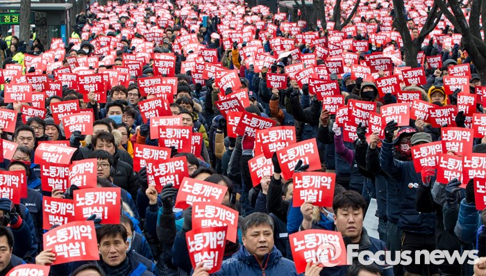 (서울=포커스뉴스) 29일 오후 서울 종로구 정부서울청사 앞에서 열린 금속노조 총파업대회에 참가한 조합원들이 노동개악을 규탄하는 손팻말을 들고 있다.