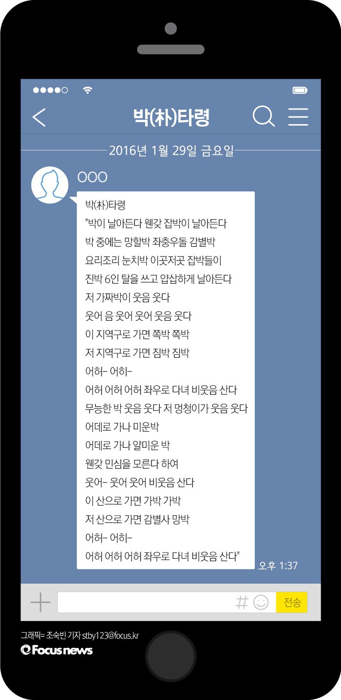 최근 페이스북 등 SNS와 카카오톡 메신저를 타고 급속도로 퍼지고 있는 노래의 첫 소절이다. '박(朴)타령'이란 제목의 이 노래는 민요 '새타령'을 재치 있게 개사한 가사로 누리꾼들 사이에서 큰 인기를 끌고 있다.