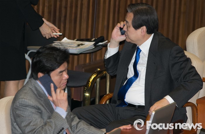 (서울=포커스뉴스) 29일 오후 서울 여의도 국회에서 예정된 338회 국회(임시회) 4차 본회의에 참석한 김무성(오른쪽) 새누리당 대표와 원유철 원내대표가 누군가와 통화하고 있다.