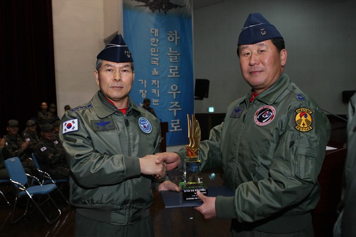 (서울=포커스뉴스) 29일 충북 충주시 19전투비행단에서 열린 '2015년 안전 우수부대 시상식'에서 정경두(왼쪽) 공군참모총장이 안전 최우수 부대로 선정된 박인호 19전투비행단 단장에게 기념패를 수여하고 있다. <사진제공=공군>