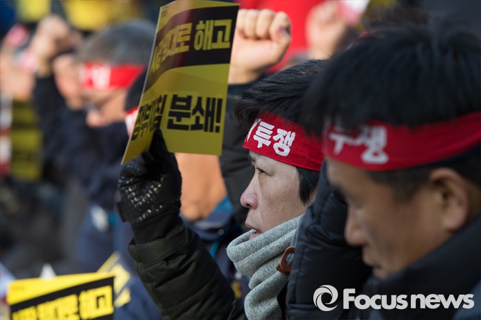 (서울=포커스뉴스) '민주노총 전국노동자대회'가 열린 30일 오후 서울광장에서 민주노총 조합원들이 정부의 '일반 해고'와 '취업규칙 변경' 양대 지침 철회와 노동개악 중단을 촉구하고 있다.
