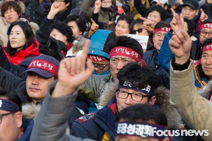 (서울=포커스뉴스) '민주노총 전국노동자대회'가 열린 30일 오후 서울광장에서 민주노총 조합원들이 정부의 '일반 해고'와 '취업규칙 변경' 양대 지침 철회와 노동개악 중단을 촉구하고 있다.