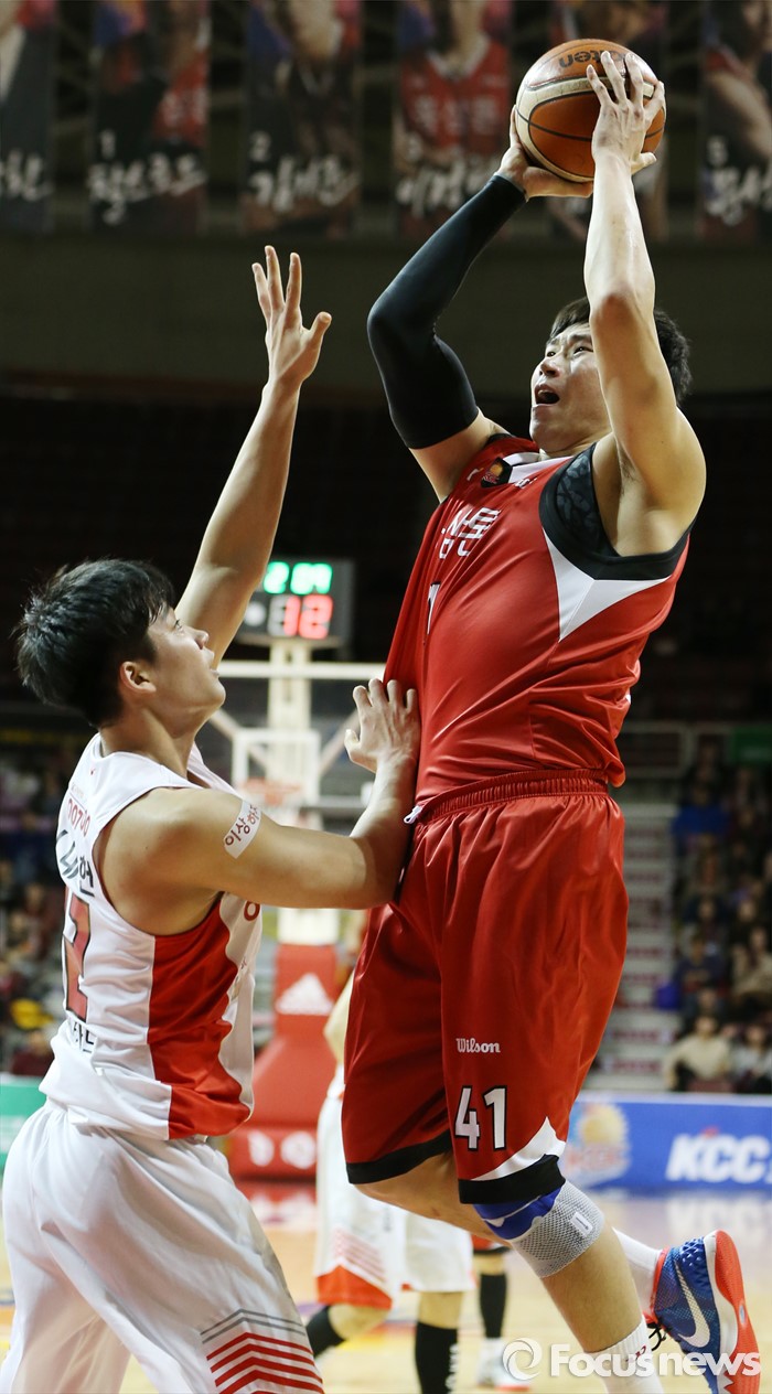 (안양=포커스뉴스) 31일 안양실내체육관에서 열린 2015-2016 프로농구 KGC-SK 경기에서 KGC 오세근이 SK 이대헌의 마크를 받으며 점프슛을 시도하고 있다.