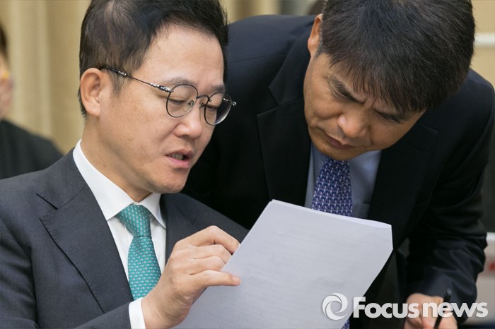 | △ 논의하는 강석훈 단장 |