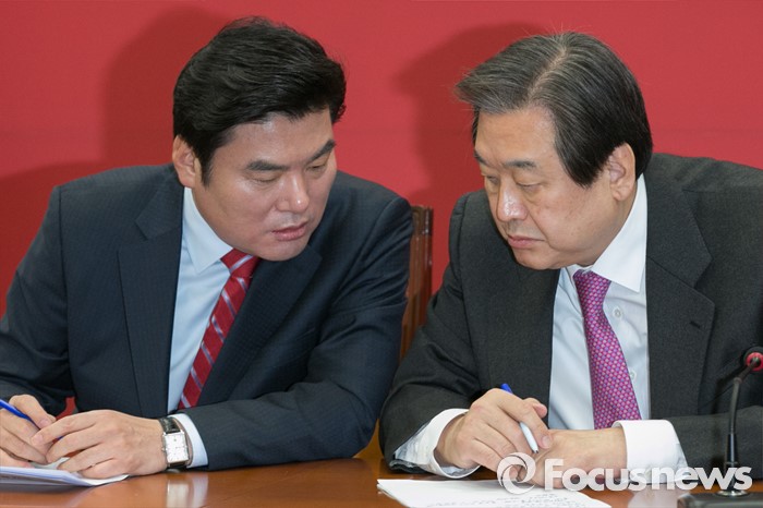 (서울=포커스뉴스) 김무성(오른쪽) 새누리당 대표와 원유철 원내대표가 1일 오전 서울 여의도 국회에서 열린 최고위원회의에 참석해 대화하고 있다.