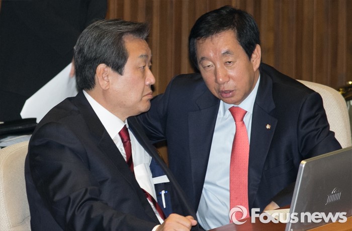 또 최 전 부총리는 유승민 전 원내대표를 겨냥해 "'증세 없는 복지는 허구'라고 뒷자리 잡았다"면서 "오죽 답답했으면 김무성 대표가 '그거 우리 당론 아니다' (말했겠나)"라고 밝혔다.12일 오후 서울 여의도 국회에서 열린 337회 국회(정기회) 11차 본회의에 참석한 김무성(왼쪽) 새누리당 대표와 김성태 예결위 여당 간사가 대화하고 있다. 2015.11.12 박동욱 기자
