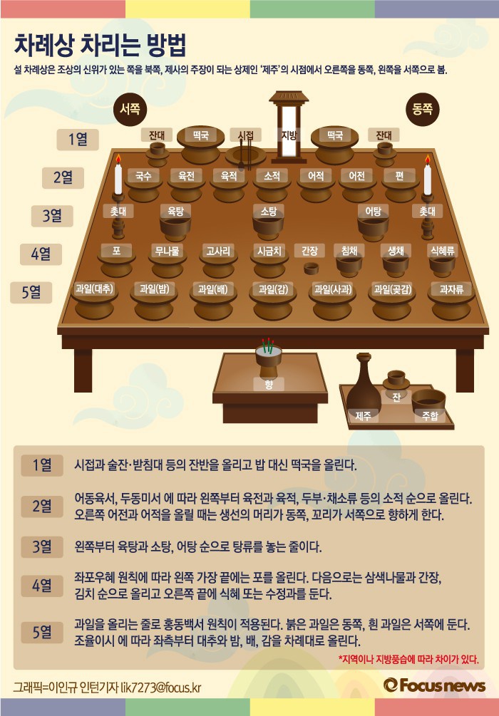 (서울=포커스뉴스) 설 차례상은 조상의 신위가 있는 쪽을 북쪽, 제사의 주장이 되는 상제인 ‘제주’의 시점에서 오른쪽을 동쪽, 왼쪽을 서쪽으로 본다.