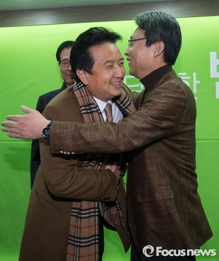 (서울=포커스뉴스) 김성식 전 의원이 1일 오전 서울 마포구 국민의당 당사에서 국민의당 합류 기자회견을 마친 후 김영환 전략위원장과 포옹하고 있다.