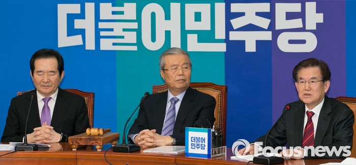 (서울=포커스뉴스) 1일 오전 서울 여의도 국회에서 열린 더불어민주당 유능한경제정당위원회, 더불어 잘사는 경제를 위한 '더불어 성장론' 정책발표 기자회견에 참석한 강철규(오른쪽) 유능한경제정당위원회 공동위원장이 발언하고 있다. 왼쪽은 정세균 공동위원장, 가운데는 김종인 비대위원장.