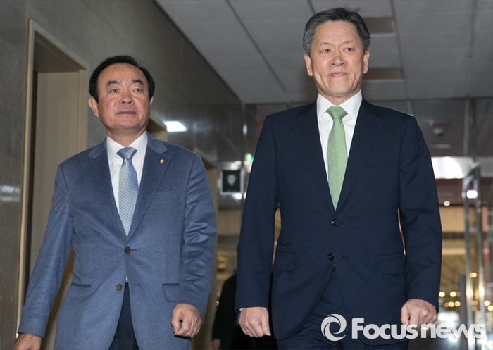 (서울=포커스뉴스) 주승용(오른쪽) 국민의당 원내대표와 장병완 정책위의장이 1일 오전 서울 여의도 국회에서 정의화 국회의장과의 면담을 위해 의장실로 향하고 있다.